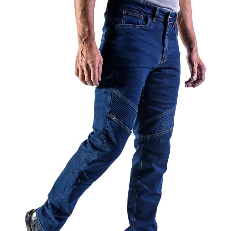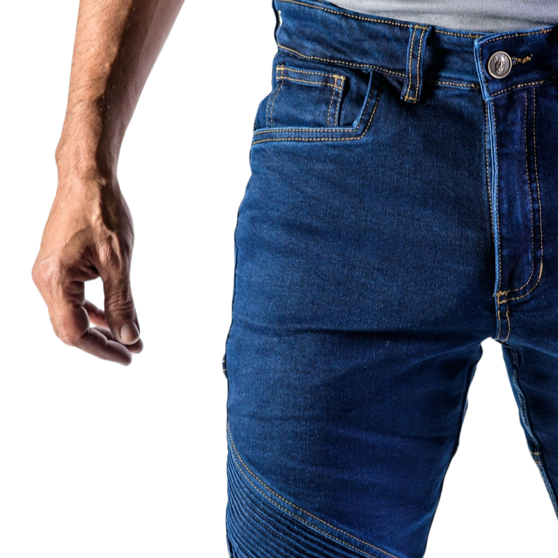 Blue denim pants with ergonomic details, designed to provide safety and comfort on long rides. Made with DuPont™ Kevlar® protection in strategic areas for added safety. Their modern design is ideal for demanding motorcyclists.