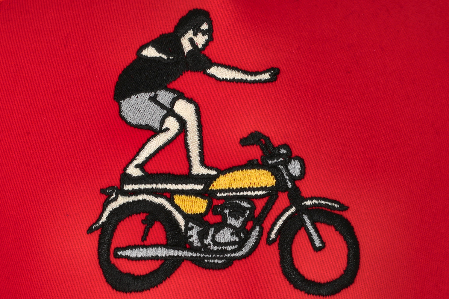 Estilo clásico bordado frontal de biker haciendo wheelie sobre una moto clásica