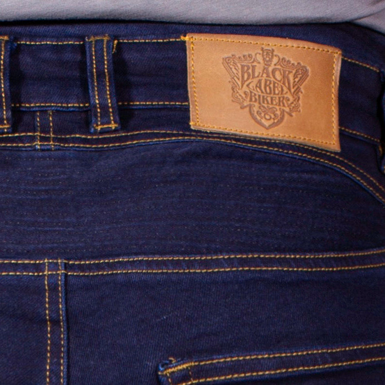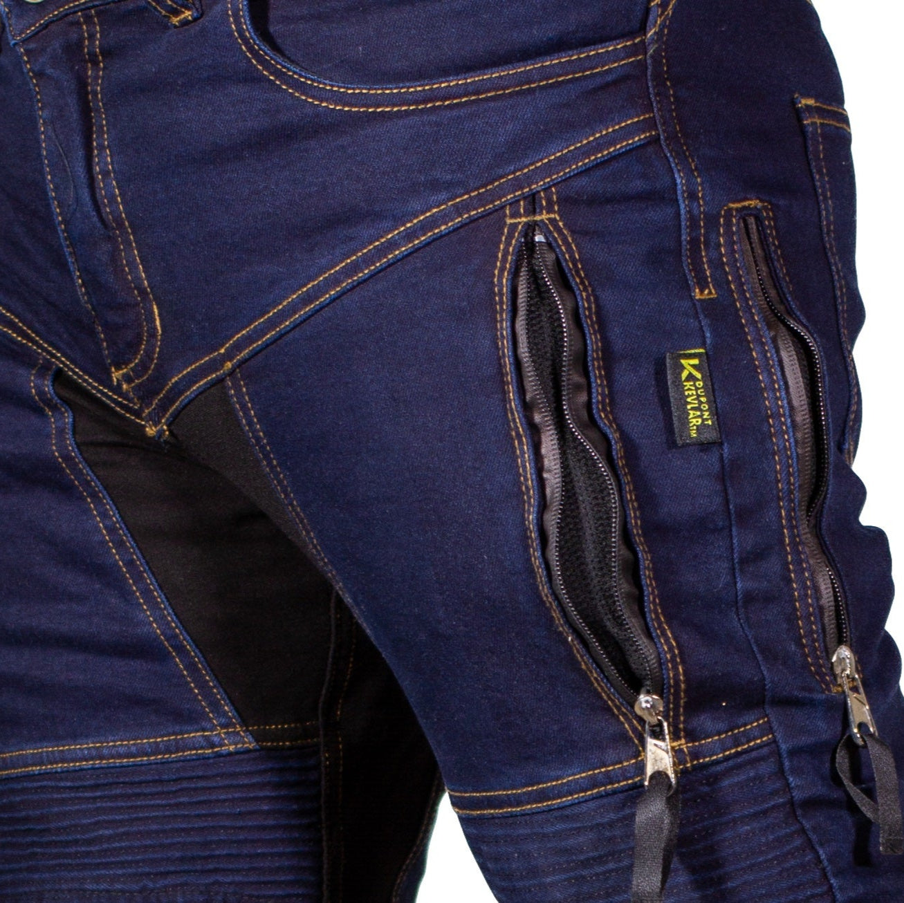 Denim reforzado con Kevlar® en las rodillas y caderas.