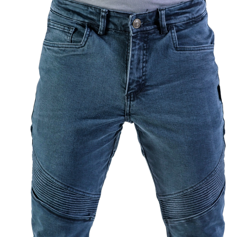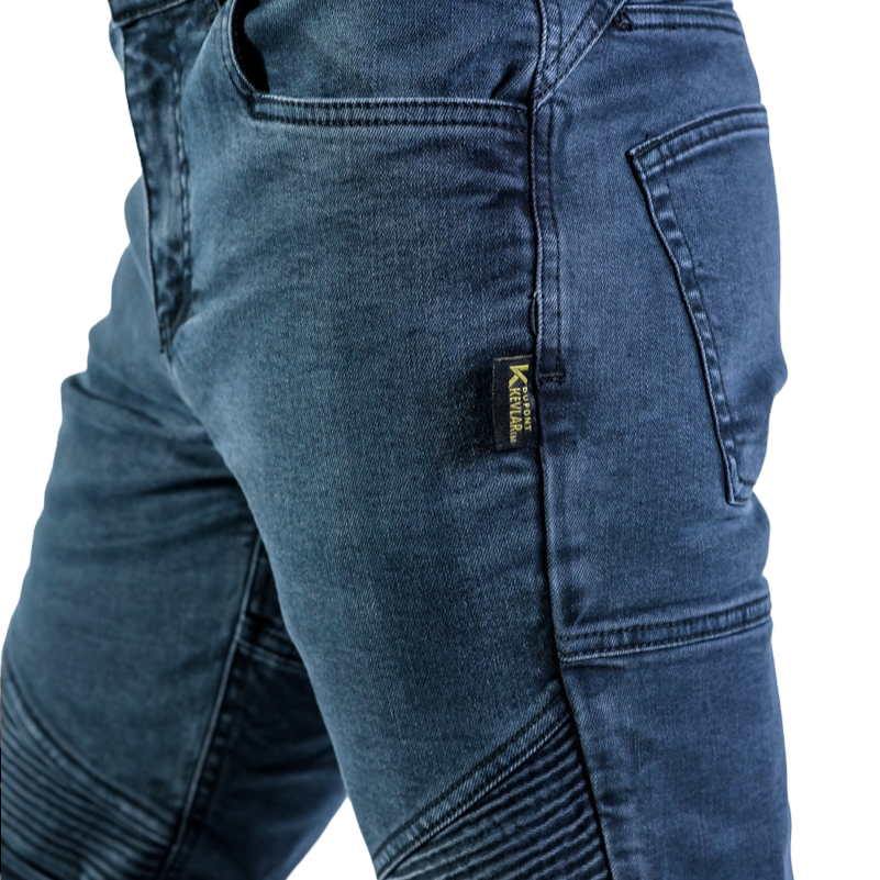 Denim reforzado con Kevlar® en las rodillas y caderas.