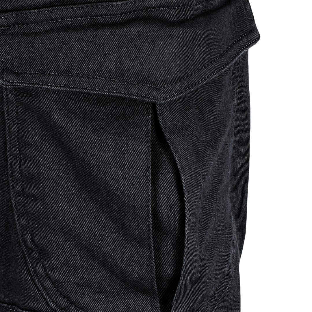 Pantalón tipo cargo en color negro fabricado en gabardina gruesa y con protección DuPont™ Kevlar® en zonas estratégicas para mayor seguridad.